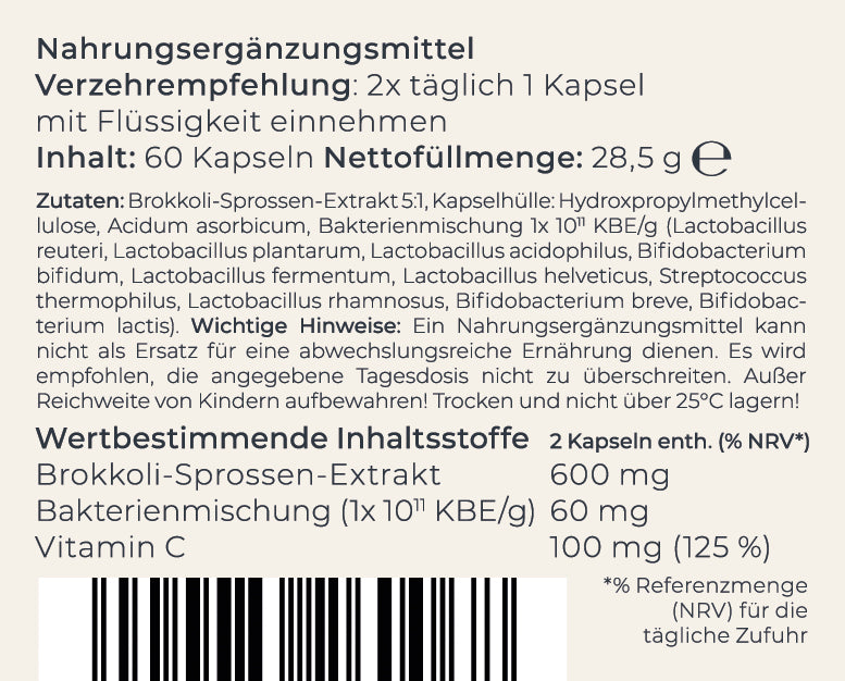 Inhaltsstoffe: 2 Kapseln enthalten (%NRV*): Broccoli-Sprossenextrakt 600 mg, Bakterienmischung (1x1011KBE/g)** 60 mg, Vitamin C 100 mg (125 %) (*% Referenzmenge (NRV) für die tägliche Zufuhr), ** Lactobacillus reuteri, Lactobacillus plantarum, Lactobacillus acidophilus, Bifidobacterium bifidum, Lactobacillus fermentum, Lactobacillus helveticus, Streptococcus thermophilus, Lactobacillus rhamnosus, Bifidobacterium breve, Bifidobacterium lactis Packungsgröße: 60 Stück Kapseln Verzehrempfehlung: 2x täglich 1 Kapsel mit Flüssigkeit einnehmen.