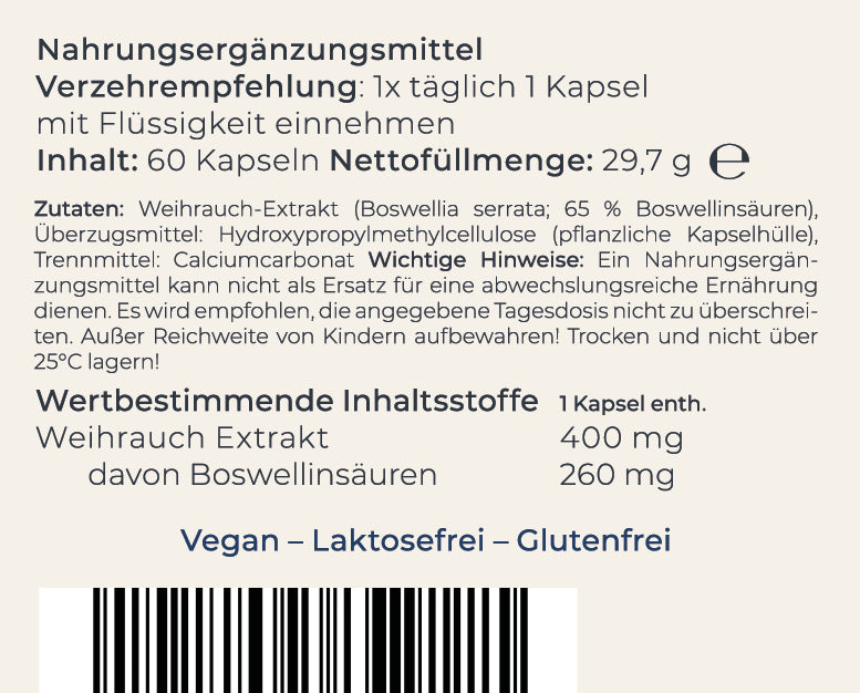 Inhaltsstoffe: 1 Kapsel enthält (%NRV*): Weihrauch Extrakt: 400 mg davon Boswellinsäuren: 260 mg Weihrauch-Extrakt (Boswellia serrata; 65 % Boswellinsäuren), Überzugsmittel: Hydroxypropylmethylcellulose (pflanzliche Kapselhülle), Trennmittel: Calciumcarbonat (*% Referenzmenge (NRV) für die tägliche Zufuhr)